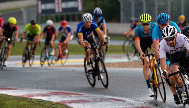Nach einer Einführungsrunde mit dem etwa 200 FahrerInnen großen Feld erfolgt Punkt 10 Uhr der Start. Das Tempo geht sofort hoch, das Fahren im Feld auf der Rennstrecke erfordert volle Aufmerksamkeit und Konzentration. Speziell die Richtungswechsel in den Schikanen sind in mitten im Feld immer ein wenig stressig. Dazu Runde um Runde heftige Sprints am kleinen Hügel, hinter Kurven … mir wird schnell klar, dass das so nicht 12 Stunden gutgehen wird. Den Staffeln mit 2 bis 6 Fahrern kann es egal sein, die wechseln einfach die Fahrer durch. Ich lasse mich nach einer guten Stunde im Feld mit einem 42er Schnitt aus dem Feld zurück fallen, fahre noch ein wenig mit einen abgehängten Gruppe und lege dann auch irgendwann schon leicht angeknockt die erste Pause ein. Fortan suche ich mir Gruppen, die mein Tempo fahren, mal gelingt es, mal nicht so. Die regelmäßigen Boxenstops werden länger, ich zwinge mich dazu, regelmäßig etwas zu essen, Appetit habe ich eher keinen. Die Temperaturen haben sich inwischen bei über 30 Grad eingepegelt, das Tempo geht klar in Richtung ‚Touri‘, die Gruppen werden weniger, schon am frühen Nachmittag sind sehr viele FahrerInnen, auch StaffelteilnehmerInnen arg gebeutelt. Dagegen zieht das Peloton mit immer noch einigen Dutzend FahrerInnen unbeirrt seine Bahnen und überrundet regelmäßig die ganzen Versprengten.